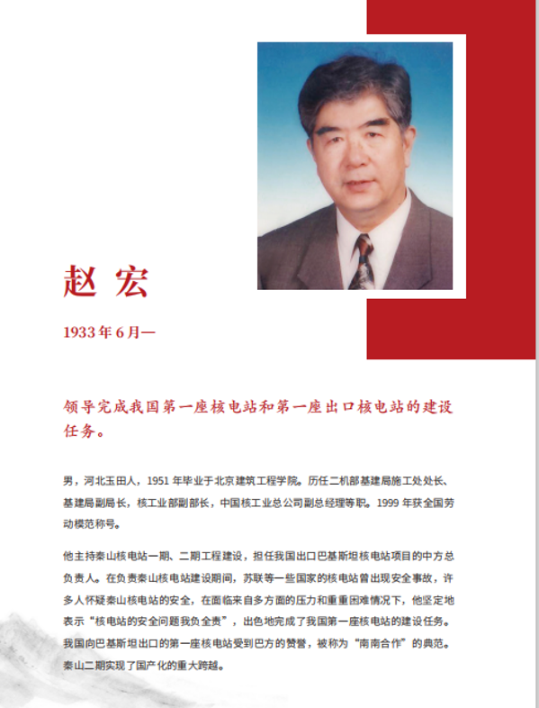 趙宏,中國共產(chǎn)黨員,核工業(yè)功勛。從事建筑行業(yè)50余年,先后在市政建設(shè)、鋼鐵工業(yè)、核燃料系統(tǒng)、核電站、石化工業(yè)建設(shè)等諸多領(lǐng)域做出杰出成就。他參與和主持的部分國內(nèi)外矚目的大型項目,已被載入史冊。以核工業(yè)部副部長身份兼任秦山核電總經(jīng)理,從運籌帷幄的指揮者到具體執(zhí)行者,從經(jīng)歷核電建設(shè)初期的溝溝坎坎,到迎來中國核電的大發(fā)展,趙宏可以說是新中國核工業(yè)發(fā)展特別是核電建設(shè)歷史的最忠實見證者和參與者。
